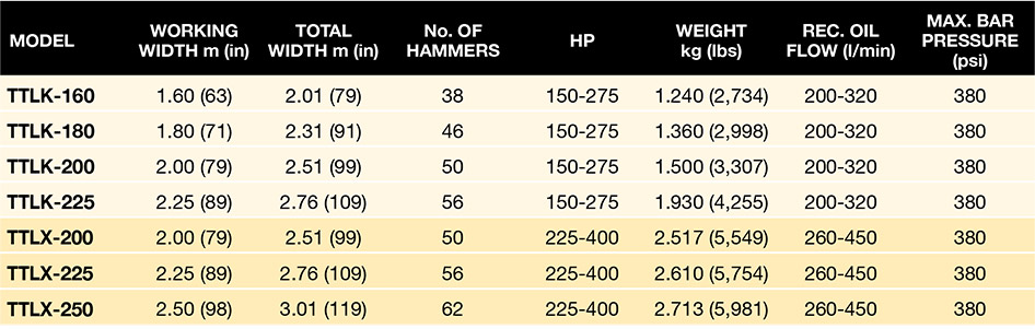 The TTLK mulcher features a 45 mm wide “single stage” tungsten carbide hammer. The TTLX mulcher features a 55 mm wide “two stage” tungsten carbide hammer.