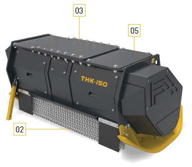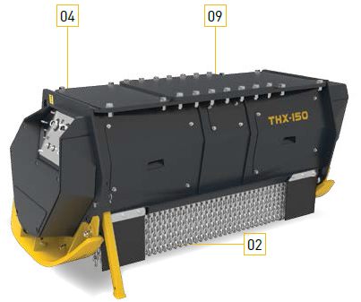Replaceable hammers made of hard alloys with carbide wear points (F03 Hammers on center rotor, F04 hammer on side).
